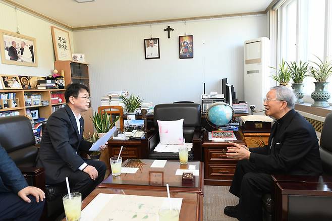 [서울=뉴시스] 조수정 기자 = 최응천(왼쪽) 문화재청장이 27일 오후 광주광역시 천주교 광주대교구청 본관에서 김희중 히지노 광주대교구 대주교를 만나 국가등록문화재인 광주대교구청 브레디관의 보수공사 등으로 면담하고 있다. (사진=문화재청 제공) 2022.09.27. photo@newsis.com