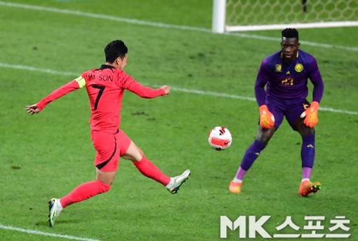 한국의 손흥민이 카메룬 골키퍼와 1-1 상황을 맞았지만 센터링된 볼이 길어 득점으로 연결시키지 못했다.