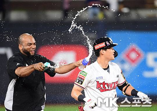 9회말 1사 2, 3루에서 kt 배정대가 끝내기 안타를 치고 데스파이네로 부터 물세례를 받고 있다.