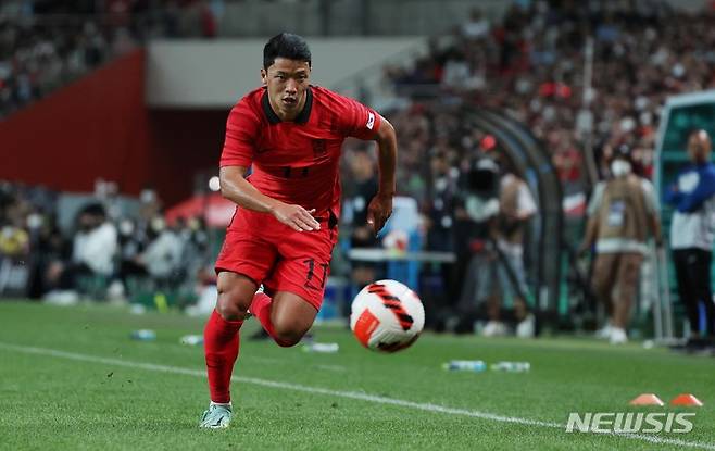 [서울=뉴시스] 백동현 기자 = 27일 오후 서울 마포구 서울월드컵경기장에서 열린 하나은행 초청 축구 국가대표 평가전 대한민국과 카메룬의 경기 후반전, 황희찬이 드리블하고 있다. 2022.09.27. livertrent@newsis.com