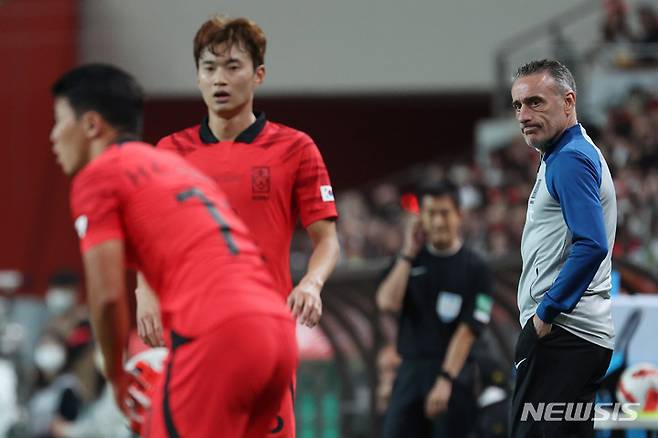 [서울=뉴시스] 백동현 기자 = 27일 오후 서울 마포구 서울월드컵경기장에서 열린 하나은행 초청 축구 국가대표 평가전 대한민국과 카메룬의 경기 후반전, 벤투 감독이 경기를 바라보고 있다. 2022.09.27. livertrent@newsis.com