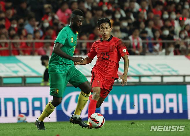 [서울=뉴시스] 백동현 기자 = 27일 오후 서울 마포구 서울월드컵경기장에서 열린 하나은행 초청 축구 국가대표 평가전 대한민국과 카메룬의 경기 후반전, 정우영이 상대를 압박하고 있다. 2022.09.27. livertrent@newsis.com