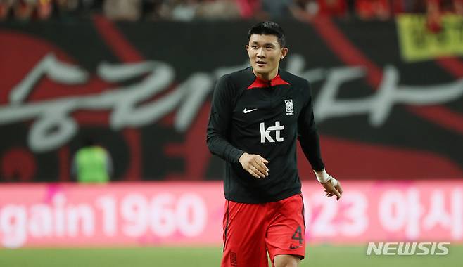 [서울=뉴시스] 조성우 기자 = 27일 오후 서울 마포구 서울월드컵경기장에서 열린 하나은행 초청 축구 국가대표 평가전 대한민국과 카메룬의 경기, 1-0으로 승리를 거둔 한국 김민재가 팬들에게 인사하고 있다. 2022.09.27. xconfind@newsis.com