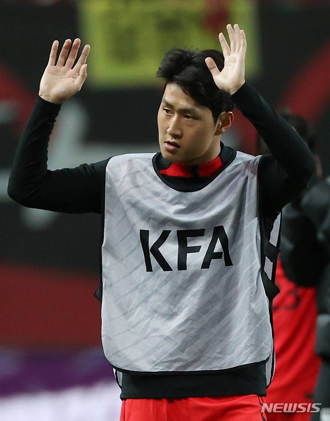 [서울=뉴시스] 조성우 기자 = 27일 오후 서울 마포구 서울월드컵경기장에서 열린 하나은행 초청 축구 국가대표 평가전 대한민국과 카메룬의 경기, 1-0으로 승리를 거둔 한국 이강인이 그라운드에 나와 팬들에게 인사하고 있다. 2022.09.27. xconfind@newsis.com