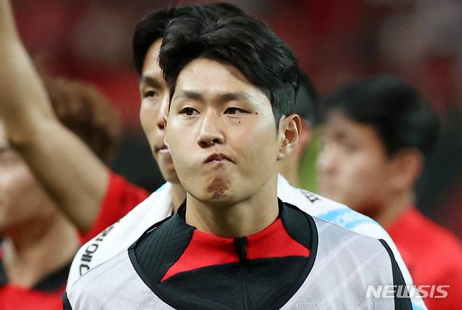 [서울=뉴시스] 조성우 기자 = 27일 오후 서울 마포구 서울월드컵경기장에서 열린 하나은행 초청 축구 국가대표 평가전 대한민국과 카메룬의 경기, 1-0으로 승리를 거둔 한국 이강인이 그라운드에 나와 팬들에게 인사하고 있다. 2022.09.27. xconfind@newsis.com