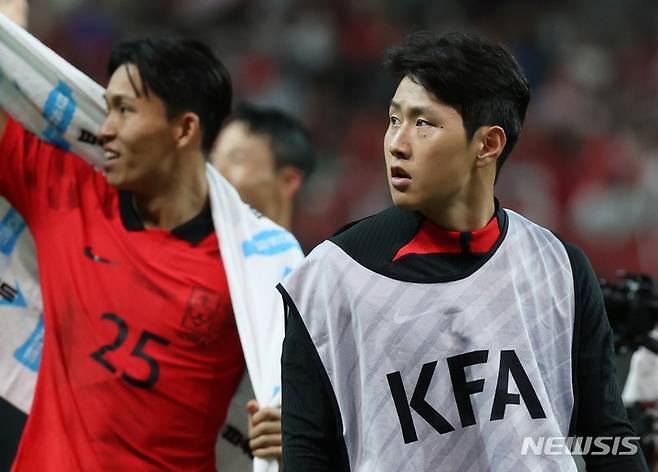 [서울=뉴시스] 조성우 기자 = 27일 오후 서울 마포구 서울월드컵경기장에서 열린 하나은행 초청 축구 국가대표 평가전 대한민국과 카메룬의 경기, 1-0으로 승리를 거둔 한국 이강인이 그라운드에 나와 팬들에게 인사하고 있다. 2022.09.27. xconfind@newsis.com