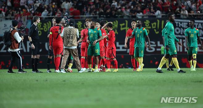 [서울=뉴시스] 백동현 기자 = 27일 오후 서울 마포구 서울월드컵경기장에서 열린 하나은행 초청 축구 국가대표 평가전 대한민국과 카메룬의 경기 종료 후 선수들이 서로 인사하고 있다. 2022.09.27. livertrent@newsis.com