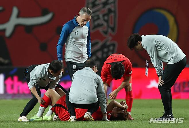 [서울=뉴시스] 조성우 기자 = 27일 오후 서울 마포구 서울월드컵경기장에서 열린 하나은행 초청 축구 국가대표 평가전 대한민국과 카메룬의 경기, 1-0으로 승리를 거둔 한국 벤투 감독이 그라운드에 누워있는 김진수 상태를 확인하고 있다. 2022.09.27. xconfind@newsis.com