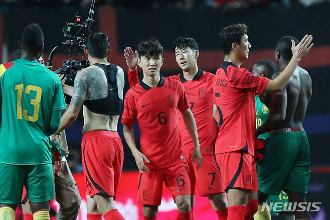 [서울=뉴시스] 조성우 기자 = 27일 오후 서울 마포구 서울월드컵경기장에서 열린 하나은행 초청 축구 국가대표 평가전 대한민국과 카메룬의 경기, 1-0으로 승리를 거둔 한국 손흥민 등 선수들이 카메룬 선수들과 인사를 나누고 있다. 2022.09.27. xconfind@newsis.com