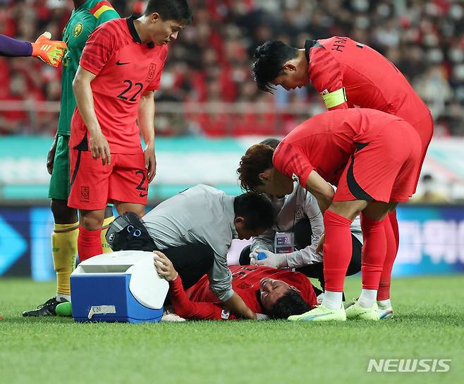 [서울=뉴시스] 백동현 기자 = 27일 오후 서울 마포구 서울월드컵경기장에서 열린 하나은행 초청 축구 국가대표 평가전 대한민국과 카메룬의 경기 후반전, 선수들이 쓰러진 황의조를 걱정하고 있다. 2022.09.27. livertrent@newsis.com