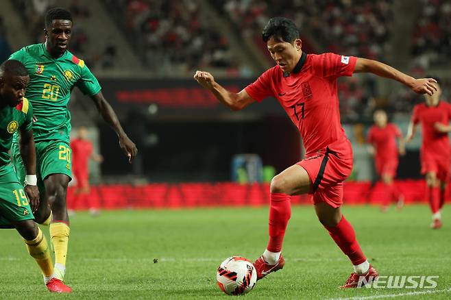 [서울=뉴시스] 백동현 기자 = 27일 오후 서울 마포구 서울월드컵경기장에서 열린 하나은행 초청 축구 국가대표 평가전 대한민국과 카메룬의 경기 후반전, 나상호가 드리블하고 있다. 2022.09.27. livertrent@newsis.com
