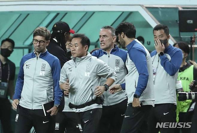 [서울=뉴시스] 김근수 기자 = 27일 오후 서울 마포구 서울월드컵경기장에서 열린 하나은행 초청 축구 국가대표 평가전 대한민국과 카메룬의 경기 종료 후, 대한민국 파울루 벤투 감독이 경기장 안으로 들어가고 있다. 2022.09.27. ks@newsis.com