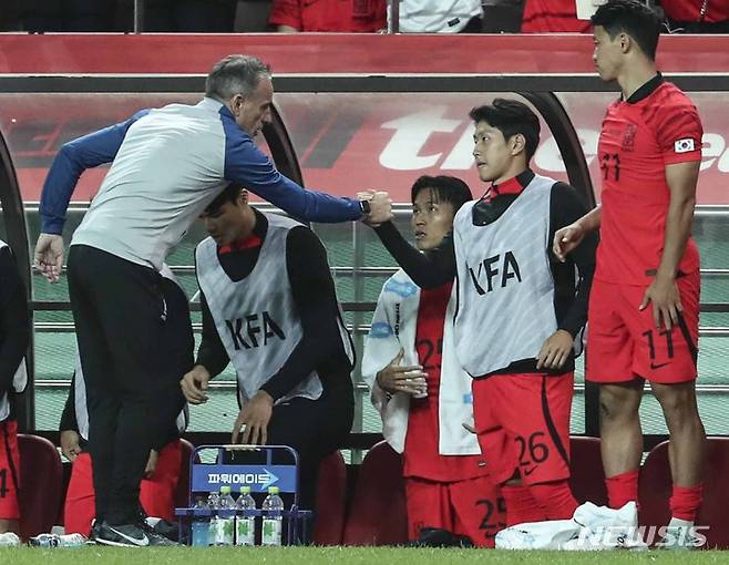 [서울=뉴시스] 김근수 기자 = 27일 오후 서울 마포구 서울월드컵경기장에서 열린 하나은행 초청 축구 국가대표 평가전 대한민국과 카메룬의 경기 종료 후, 대한민국 파울루 벤투 감독과 이강인이 서로 인사를 나누고 있다. 2022.09.27. ks@newsis.com
