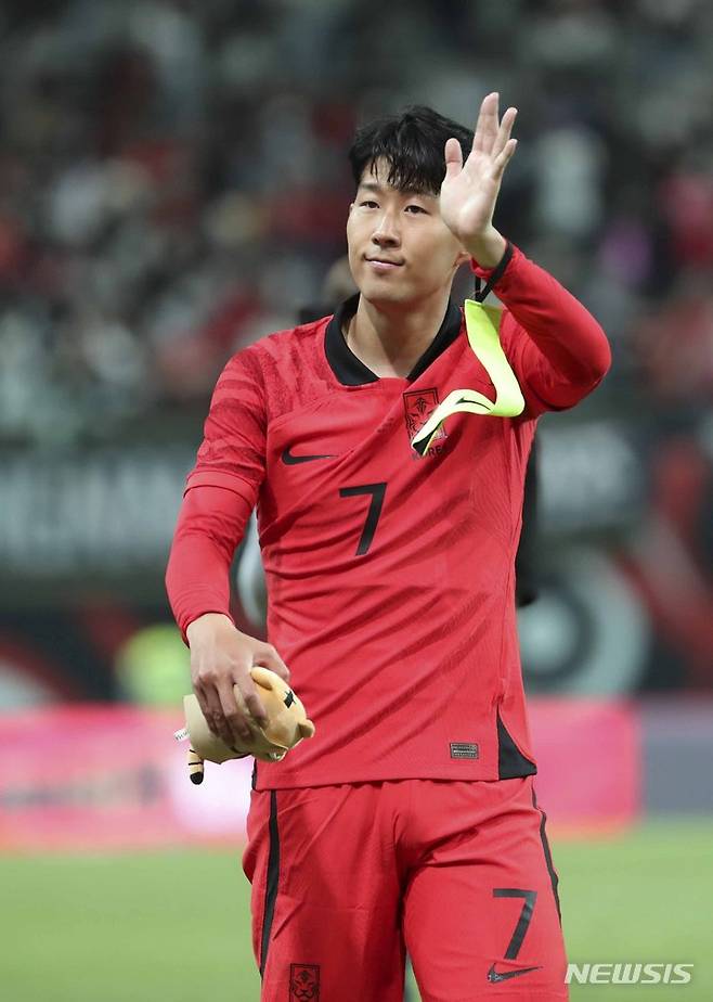 [서울=뉴시스] 김근수 기자 = 27일 오후 서울 마포구 서울월드컵경기장에서 열린 하나은행 초청 축구 국가대표 평가전 대한민국과 카메룬의 경기 종료 후, 대한민국 손흥민이 관중들에게 인사를 하고 있다. 2022.09.27. ks@newsis.com
