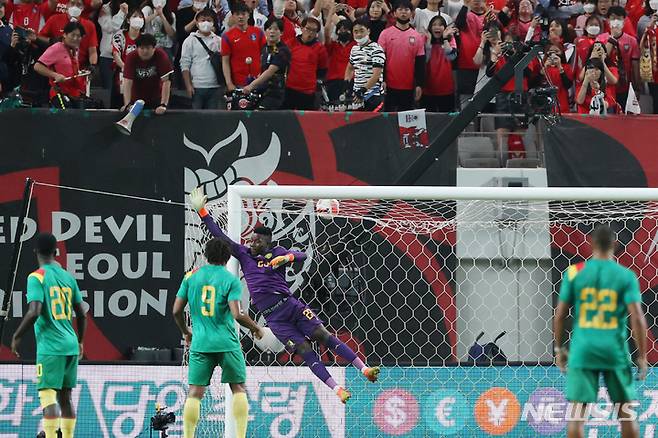[서울=뉴시스] 조성우 기자 = 27일 오후 서울 마포구 서울월드컵경기장에서 열린 하나은행 초청 축구 국가대표 평가전 대한민국과 카메룬의 경기 후반전, 한국 손흥민의 프리킥이 골문을 벗어나고 있다. 2022.09.27. xconfind@newsis.com