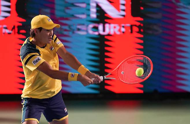 [서울=뉴시스] 조수정 기자 = 한국 테니스 권순우(121위)가 27일 서울 송파구 올림픽공원 테니스코트에서 열린 2022 코리아오픈 남자 단식 1회전(32강)에서 정윤성(426위)을 상대로 경기하고 있다. 권순우는 세트스코어 2-1로 정윤성을 이기고 16강에 진출을 확정했다. (사진= 유진투자증권 코리아오픈 대회 조직위원회 제공) 2022.09.27. photo@newsis.com *재판매 및 DB 금지