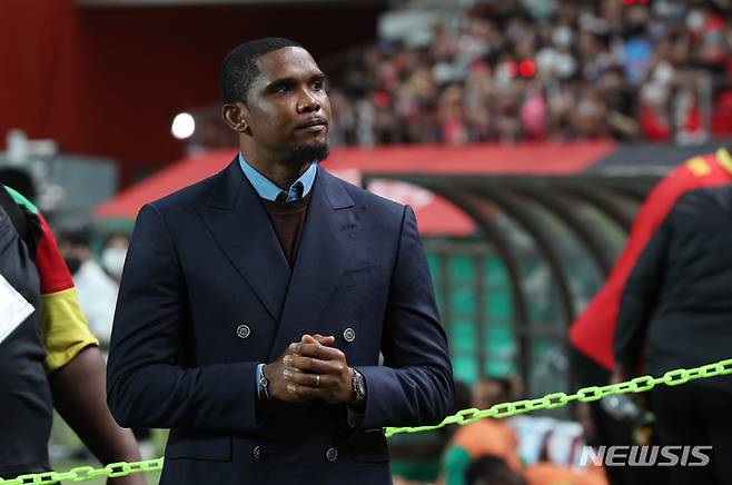 [서울=뉴시스] 백동현 기자 = 27일 오후 서울 마포구 서울월드컵경기장에서 열린 하나은행 초청 축구 국가대표 평가전 대한민국과 카메룬의 경기 시작 전 사무엘 에투 카메룬축구협회 회장이 경기장을 찾아 선수들을 기다리고 있다. 2022.09.27. livertrent@newsis.com
