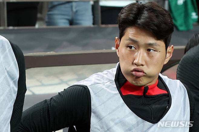 [서울=뉴시스] 백동현 기자 = 27일 오후 서울 마포구 서울월드컵경기장에서 열린 하나은행 초청 축구 국가대표 평가전 대한민국과 카메룬의 경기 시작 전 이강인이 벤치에서 대기하고 있다. 2022.09.27. livertrent@newsis.com