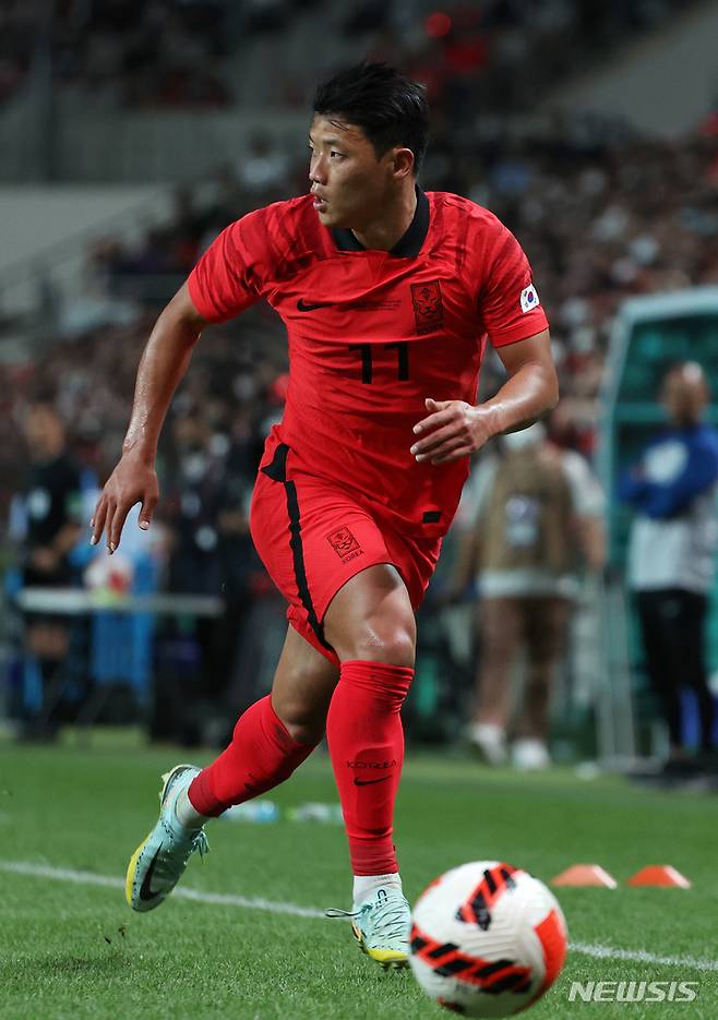 [서울=뉴시스] 백동현 기자 = 27일 오후 서울 마포구 서울월드컵경기장에서 열린 하나은행 초청 축구 국가대표 평가전 대한민국과 카메룬의 경기 후반전, 황희찬이 드리블하고 있다. 2022.09.27. livertrent@newsis.com