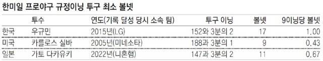 한국 프로야구에서는 우규민(37·삼성)이 LG 시절인 2015년 볼넷 17개(152와 3분의 2이닝)로 시즌을 마친 게 최소 기록이다. 우규민 이전에는 해태 김용남(64)이 1984년 132와 3분의 2이닝을 던지는 동안 볼넷 19개를 내준 게 30년 넘게 최소 기록 자리를 지키고 있었다.