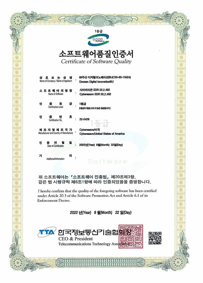 두산디지털이노베이션은 자사 사이버리즌 EDR(엔드포인트 위협·대응) 솔루션이 GS(굿 소프트웨어) 인증 최고 등급인 1등급을 획득했다고 28일 밝혔다.