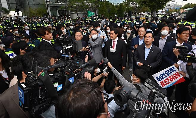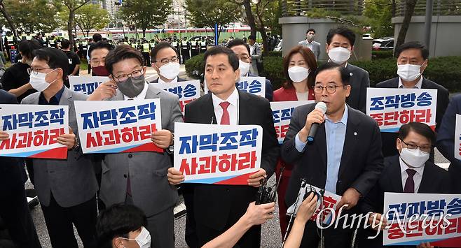 | ▲ 28일 서울 마포구 MBC 본사 앞에서 박대출 MBC 편파·조작방송 진상규명 태스크포스(TF) 위원장과 박성중 국민의힘 과학기술정보방송통신위원회 간사, 권성동 과방위원 등 국민의힘 의원들이 윤석열 대통령의 뉴욕 발언 보도에 대해 항의하고 있다. |