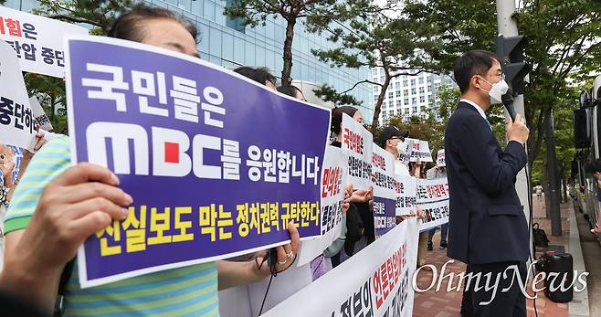 그 반대편에는 국민의힘을 규탄하는 시민들이 모였다. 이들은 '윤석열 정부의 언론탄압에 맞선 MBC사수 시민 기자회견'을 열고, 용산 대통령실과 국민의힘의 대응을 '언론탄압'으로 규정했다. 이들의 손팻말에는 "국민의힘은 언론탄압 중단하라"라는 문구가 쓰여 있었고, 발언하는 이들은 입을 모아 윤석열 대통령과 용산 대통령실 그리고 국민의힘을 비판했다. 대통령실을 향한 여러 의혹이 불거지니 "정치적 의도를 가지고 언론 탄압에 나선 것"이라며 "이제 시작이다. 앞으로 더 심해질 것"이라는 주장이었다.