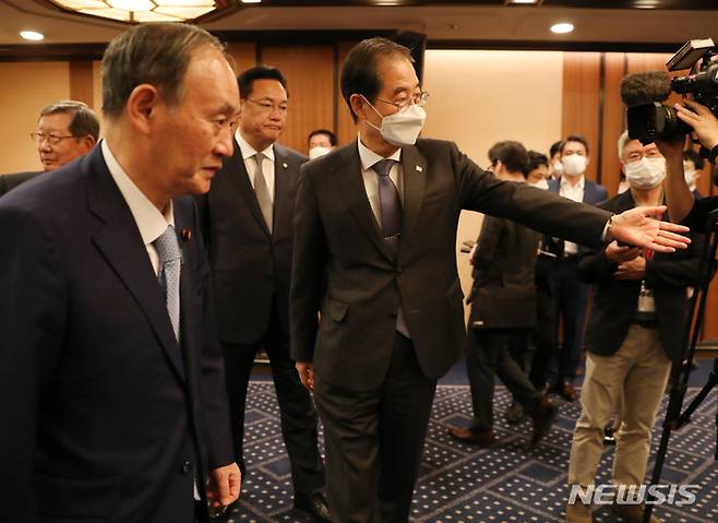 인사후 이동하는 한덕수 총리와 스가 전 일본 총리