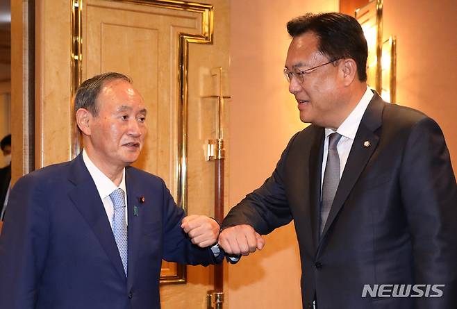 인사하는 정진석 국회부의장과 스가 요시히데 전 일본 총리
