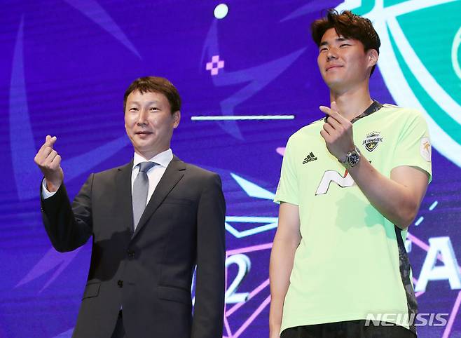 [서울=뉴시스] 김진아 기자 = 전북 현대 모터스 김상식 감독과 송범근이 28일 서울 마포구 누리꿈스퀘어에서 열린 '하나원큐 K리그1 2022 파이널라운드 미디어데이'에서 포즈를 취하고 있다. 2022.09.28. bluesoda@newsis.com