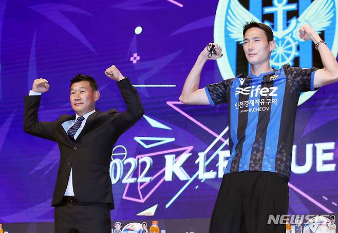 [서울=뉴시스] 김진아 기자 = 인천 유나이티드 조성환 감독과 오반석이 28일 서울 마포구 누리꿈스퀘어에서 열린 '하나원큐 K리그1 2022 파이널라운드 미디어데이'에서 포즈를 취하고 있다. 2022.09.28. bluesoda@newsis.com