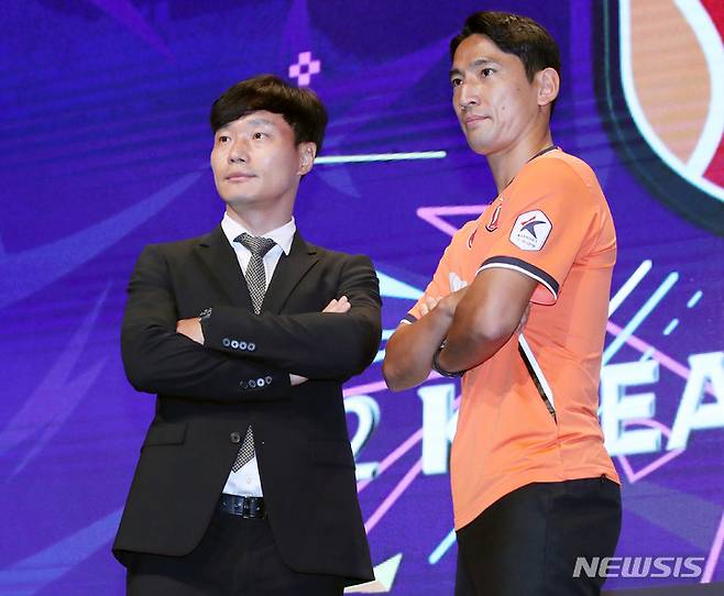 서울=뉴시스] 김진아 기자 = 제주 유나이티드 남기일 감독과 정운이 28일 서울 마포구 누리꿈스퀘어에서 열린 '하나원큐 K리그1 2022 파이널라운드 미디어데이'에서 포즈를 취하고 있다. 2022.09.28. bluesoda@newsis.com
