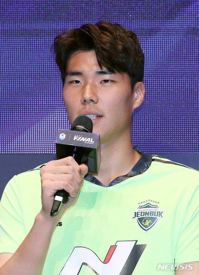 [서울=뉴시스] 김진아 기자 = 전북 현대 모터스 송범근이 28일 서울 마포구 누리꿈스퀘어에서 열린 '하나원큐 K리그1 2022 파이널라운드 미디어데이'에서 인사말을 하고 있다. 2022.09.28. bluesoda@newsis.com