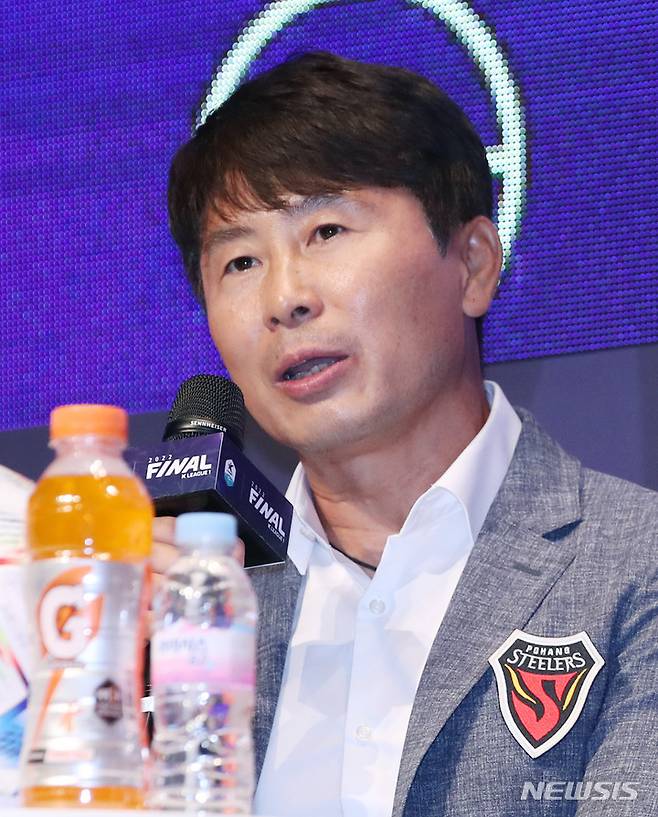 [서울=뉴시스] 김진아 기자 = 포항 스틸러스 김기동 감독이 28일 서울 마포구 누리꿈스퀘어에서 열린 '하나원큐 K리그1 2022 파이널라운드 미디어데이'에서 인사말을 하고 있다. 2022.09.28. bluesoda@newsis.com
