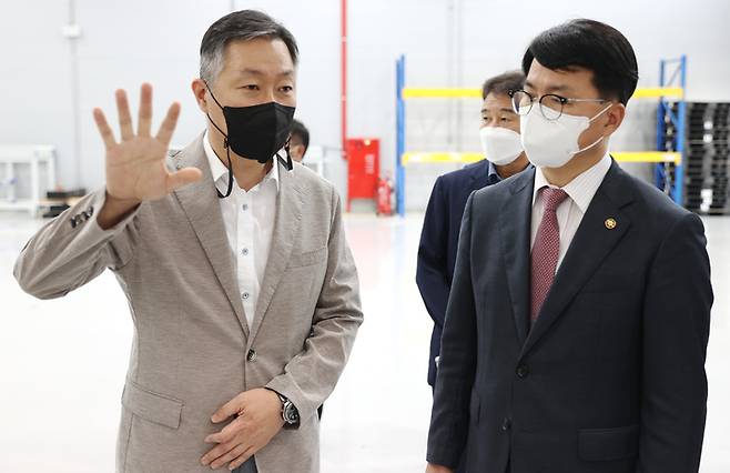[서울=뉴시스] 조주현(오른쪽) 중소벤처기업부 차관이 28일 전남 영광시 초소형 전기차 생산 특구기업 ㈜쎄보모빌리티를 방문해 홍순곤 ㈜쎄보모빌리티 이사에게 설명을 듣고 있다. (사진=중소벤처기업부 제공) 2022.09.28. photo@newsis.com *재판매 및 DB 금지