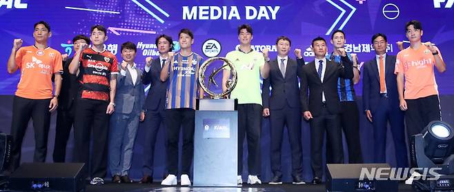 28일 서울 마포구 누리꿈스퀘어에서 열린 '하나원큐 K리그1 2022 파이널라운드 미디어데이'에서 6개팀 감독과 선수들이 포즈를 취하고 있다.