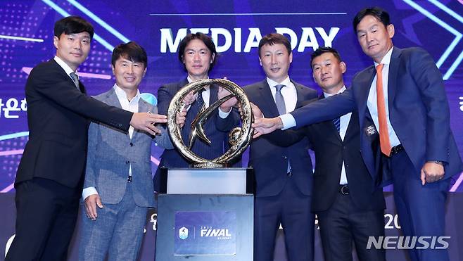 [서울=뉴시스] 김진아 기자 = 28일 서울 마포구 누리꿈스퀘어에서 열린 '하나원큐 K리그1 2022 파이널라운드 미디어데이'에서 6개팀 감독과 선수들이 포즈를 취하고 있다. 왼쪽부터 제주 유나이티드 남기일 감독, 포항 스틸러스 김기동 감독, 울산 현대 홍명보 감독, 전북 현대 모터스 김상식 감독, 인천 유나이티드 조성환 감독, 강원 FC 최용수 감독. 2022.09.28. bluesoda@newsis.com