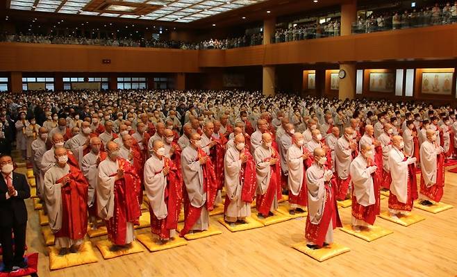 [단양=뉴시스] 이병찬 기자 = 천태종 총본산 충북 단양 구인사 광명전에서 28일 제2대 종정 대충대종사 29주기 추모 열반대재가 열리고 있다.(사진=천태종 제공) 2022.09.28. photo@newsis.com
