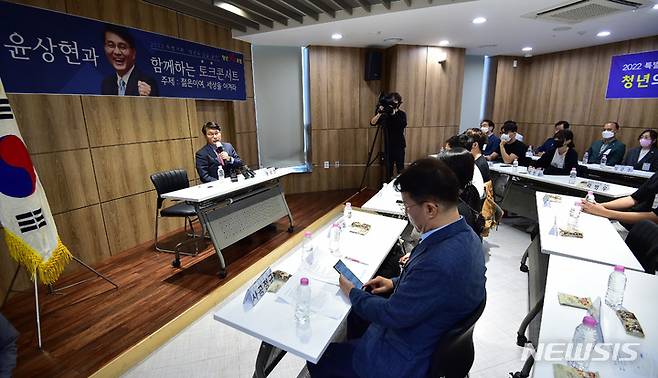 [대구=뉴시스] 이무열 기자 = 윤상현 국민의힘 의원이 28일 오후 대구 중구 한방의료체험타운에서 열린 '젊은이여, 세상을 이겨라' 주제로 토크콘서트를 하고 있다. 2022.09.28. lmy@newsis.com