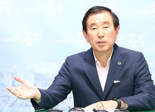 [충주=뉴시스] 이병찬 기자 = 조길형 충북 충주시장이 28일 충주시청에서 기자들과 만나 세계무술공원 명칭 변경 계획을 설명하고 있다. 2022.09.28. bclee@newsis.com