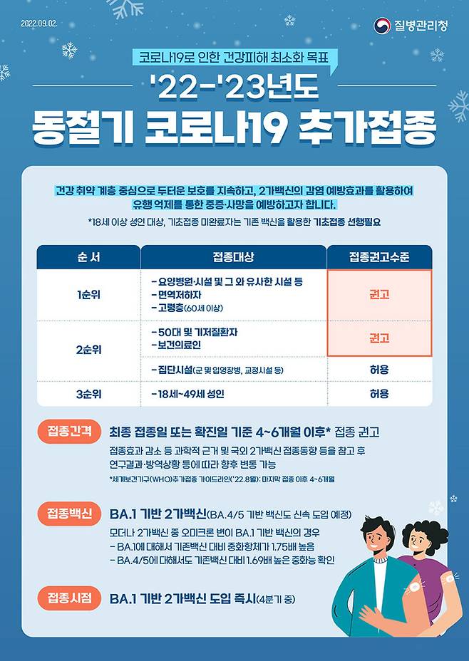 접종대상은 기초접종 1차와 2차를 완료한 18세 이상 성인이며 이중 동절기 접종 1순위에 해당하는 60세 이상 고령층과 면역저하자 등은 우선 접종을 받을 수 있다.