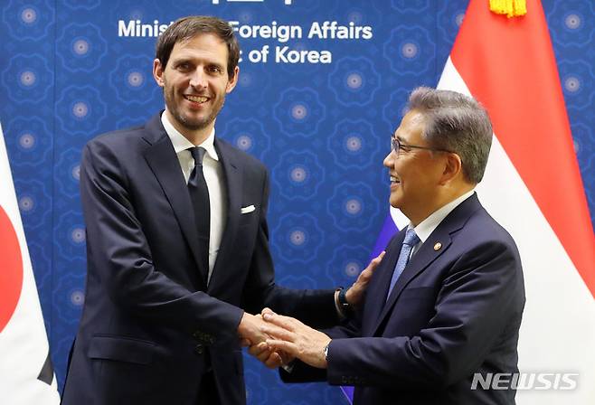 [서울=뉴시스] 배훈식 기자 = 박진(오른쪽) 외교부 장관이 28일 오후 서울 종로구 외교부 청사에서 웝크 훅스트라 네덜란드 외교장관과 회담에 앞서 악수하고 있다. 2022.09.28. dahora83@newsis.com