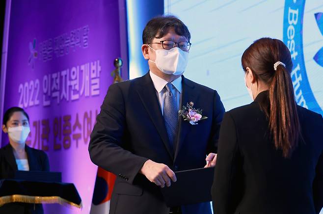 [서울=뉴시스] 고승민 기자 = 고용노동부는 28일 권기섭 차관이 2022년 인적자원개발 우수기관 인증수여식에 참석해 92개 기업에 인증패를 수여했다고 밝혔다. (사진=고용노동부 제공) 2022.09.28. photo@newsis.com *재판매 및 DB 금지