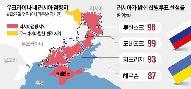 러시아는 우크라이나 내 점령지 네 곳에서 진행한 러시아 편입 찬반 주민투표에서 압도적인 찬성표가 나왔다고 27일 발표했다. 타스통신 등 러시아 언론에 따르면 러시아가 점령한 도네츠크·루한스크·자포리자·헤르손주 등 4개 지역에서 찬성률은 87~99%다. 러시아는 영토 합병 작업에 속도를 낼 계획이다. 러시아 현지 언론은 러시아가 이들 지역을 2014년 합병한 크림반도와 합쳐 ‘크림 연방관구’를 만들 계획이라고 보도했다.
