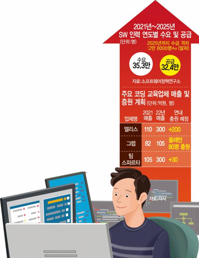 코딩 업체의 호황은 만성적인 인력 부족에 당분간 이어질 전망이다. 소프트웨어정책연구소에 따르면 2021년부터 2025년까지 소프트웨어(SW)분야 신규 인력 수요는 35만 3000명+α(알파)인 반면 공급은 32만 4000명에 그칠 것으로 전망됐다. 2025년까지 개발자 수급 격차만 2만 8000명+α라는 의미다. 업계 관계자는 “불황기에도 개발자 수요는 꾸준하고 디지털전환(DT)을 추구하는 기업들의 임직원 교육 증가도 호재로 작용해 코딩 업체의 성장세는 지속될 것”이라고 내다봤다.