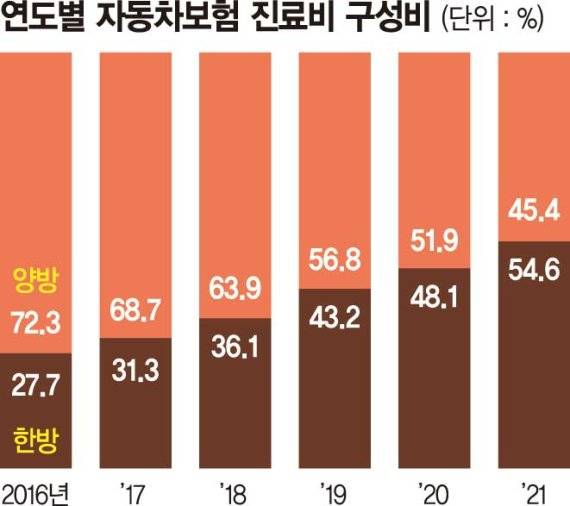 업계는 한방 자동차보험 진료의 경우 진료수가 기준이 미흡하고 무분별한 과잉 진료뿐 아니라 한의원 자체 허위 청구나 환자와 한의원간 또는 한의사간 공모를 통한 허위 청구도 빈번하게 발생한다고 설명한다. 특히 경상환자 중심의 한방 진료비는 2018년 7139억원이던 것이 지난해 1조 3066억원을 해마다 증가하고 있다.