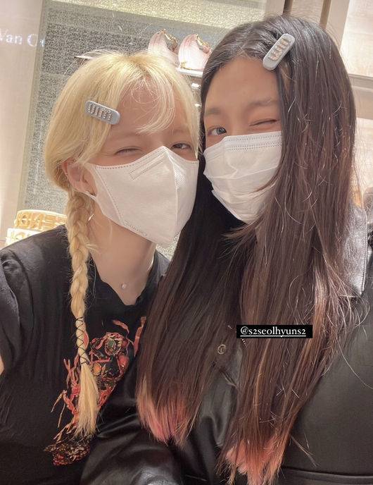 28일 지민은 자신의 인스타그램 스토리에 한 장의 사진을 공개했다. 사진 속 지민과 설현은 함께 머리를 맞대고 다정하게 윙크를 하고 있다. 또한 두 사람의 머리에는 최근 Y2K 패션이 유행하면서 두각되고 있는 브랜드 로고가 오바스럽게 박힌 헤어핀이 꽂혀 있다. 패셔너블함을 각각의 매력으로 뽐내고 있는 두 사람답게 유행에도 지지 않는 모습이다.