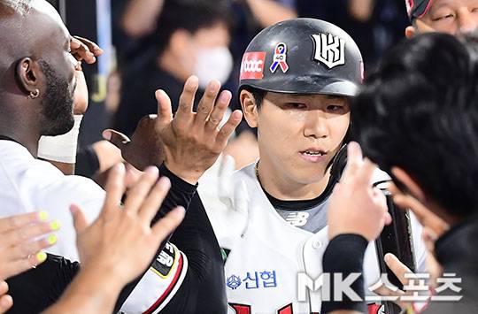 오윤석 '선제 투런포 치고 뜨거운 환영' [MK포토]