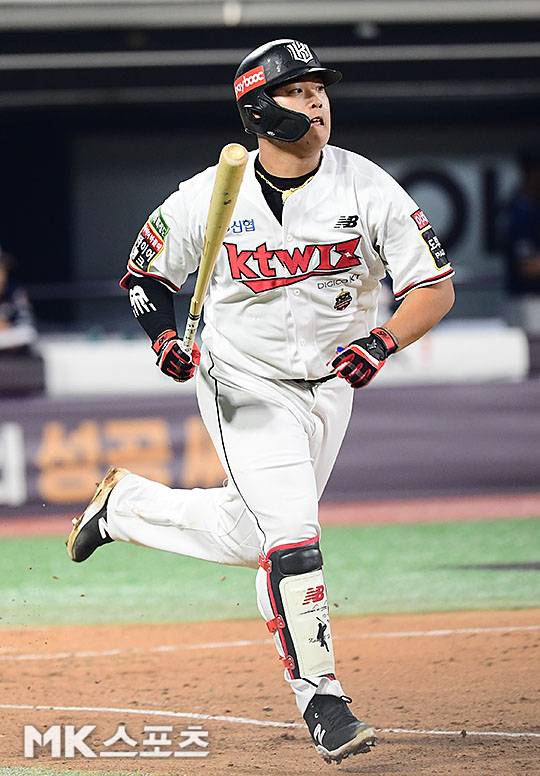 3회말 2사에서 kt 강백호가 우전안타를 치고 1루로 출루하고 있다.