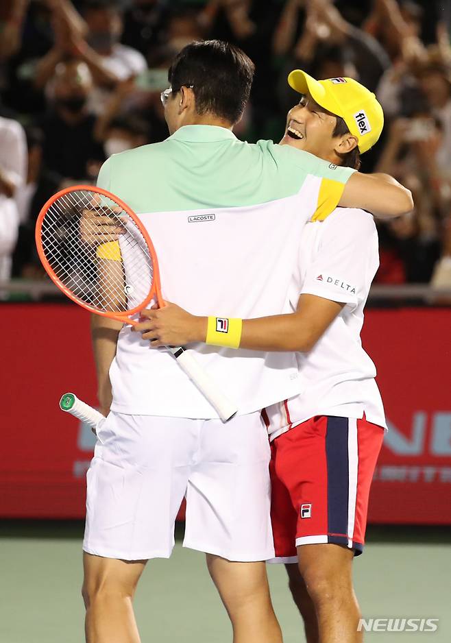 [서울=뉴시스] 김진아 기자 = 28일 오후 서울 송파구 올림픽공원 테니스경기장에서 열린 남자프로테니스(ATP) 투어 유진투자증권 코리아오픈 복식 1회전에서 한스 하흐 버두고(멕시코)-트리트 후에이(필리핀) 조에게 승리를 거둔 정현-권순우가 기뻐하고 있다. 2022.09.28. bluesoda@newsis.com